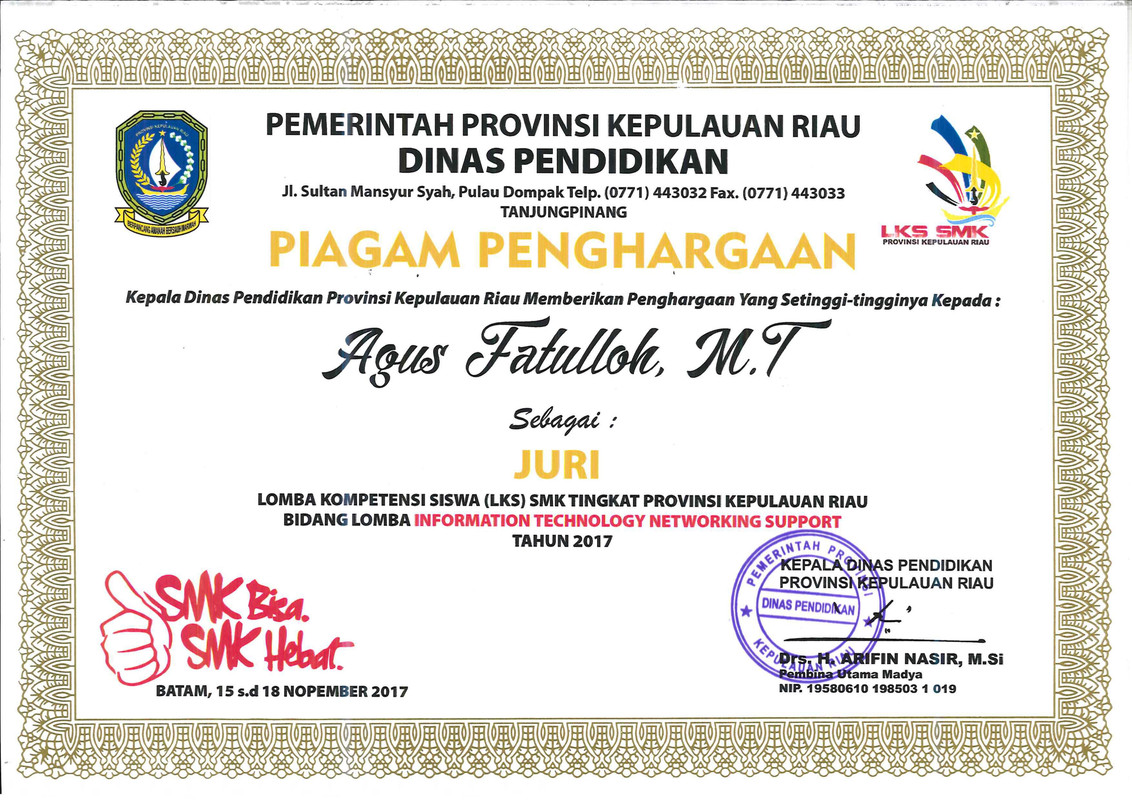 Selain sebagai pengajar aktif saya juga merupakan salah satu asesor BNSP di bawah LSP P1 Politeknik Negeri Batam sejak 2016 hingga saat ini dan pernah menjadi asesor UKK bidang Jaringan Komputer di salah satu SMK di Batam serta pernah menjadi Juri LKS SMK tingkat provinsi pada bidang Information Technology Networking Support tahun 2017 dan 2018.